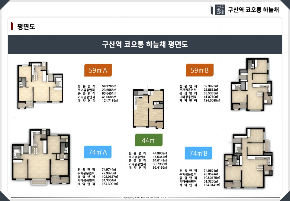 44㎡, 59㎡A, 59㎡B, 74㎡A, 74㎡B 등 5개의 중소형 평면 타입을 갖고 있으며, 선호도가 높은 59㎡, 74㎡는 A, B 타입으로 구성했습니다. A타입은 3베이의 판상형 구조로 채광과 일조량에서 보다 유리합니다. 주방과 거실 통풍 효과로 환기가 최적화될 수 있도록 설계했습니다. B타입은 타워형 구조로 각 실간 동선을 분리해 거주자의 프라이버시를 높였습니다. 각 동을 남향위주로 배치했으며 간격을 넓혀 조망권을 확보한 것이 특징입니다.