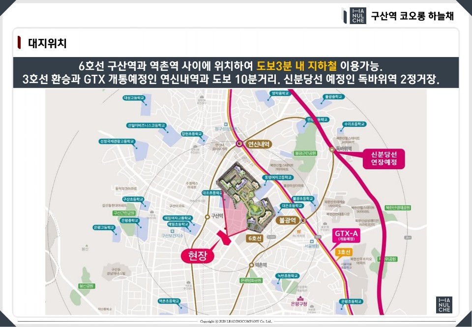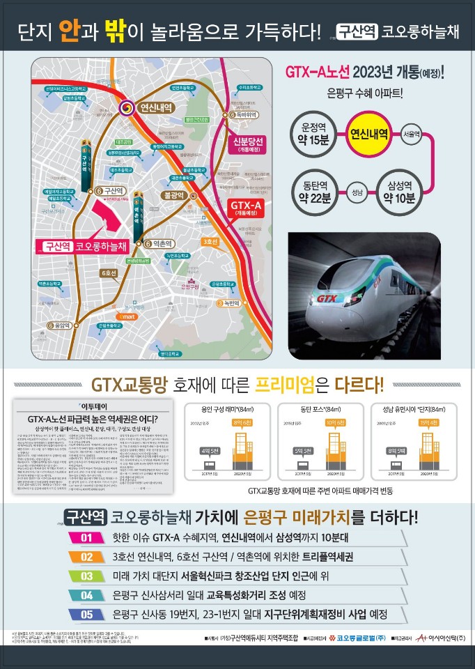 구산역에서 도보 2분 거리의 초역세권 위치를 선점한 이 아파트는 2023년 개통 예정인 GTX-A 연신내역, 신분당선 연장 예정 역인 독바위 역과 가깝습니다.