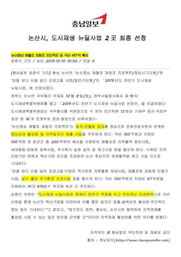 - 『2019년도 하반기 도시재생 뉴딜사업』에 선정되어, 국비 100억원과 지방비 67억을 지원받아 4년 동안 중심상권 활성화 및 지역일자리 창출 사업, 살기 좋은 주거환경 조성사업 등 현재 추진중->지역의 활성화, 신규아파트 가치상승.