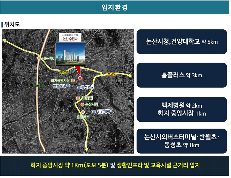 - 논산수린나를 포함 5개의 아파트단지가 들어서 1500세대 이상이 형성되어 있음.