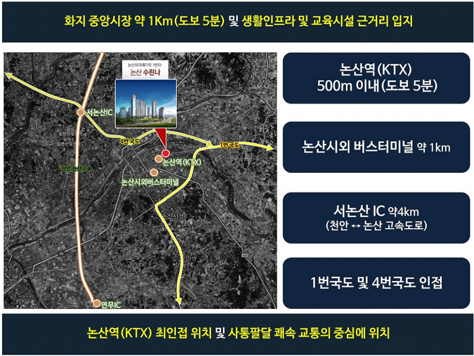 - 논산역 350M 역세권/800m이내 시외버스터미널/1.2km이내 고속버스 터미널->대중교통 편이성이 매우 좋음