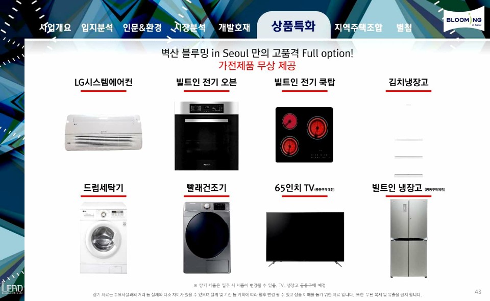 각 세대별 시스템에어컨, 김치냉장고, 드럼세탁기, 빨래건조기, 빌트인 전기오븐, 빌트인 전기쿡탑 등