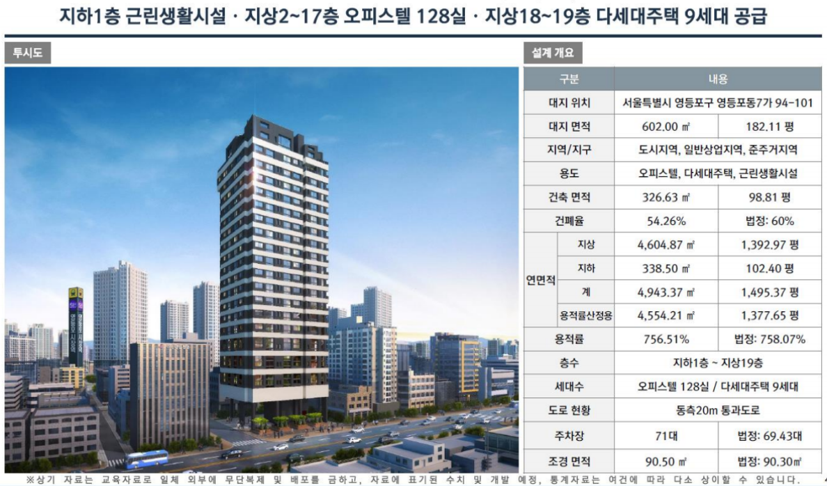 지상1층 근린생활시설 / 지상2층~17층 오피스텔128실 / 지상 18~19층 다세대주택