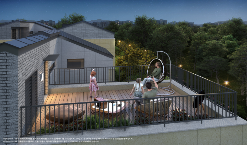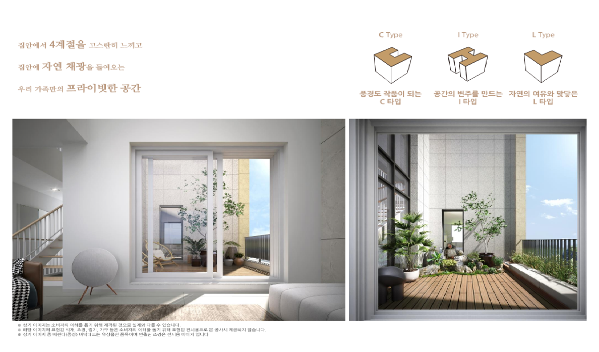 1층 개별 정원, 2층 중정, 4층 다락 및 루프 테라스