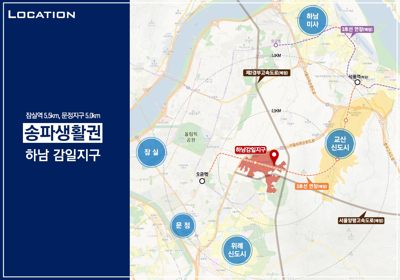 감일지구 다소 생소 하신분들도 많으시죠? 이 지구는 송파와 경계를 하고 있습니다. 동남권 비지니스의 메카로 검증된 문정법조타운이 인접 (거리상 약 5km, 차량이동 약 5분)해 있며, 행적구역상으론 경기도 하남시에 속하지만 생활권은 강동과 송파인 지역으로 아파트시세도 높게 형성이 되어 있습니다. 서울외곽순환도로 서하남IC를 끼고 위례신도시와 송파구와 맞닿아 있으면서 제3기 신도시로 지정된 교산지구와도 인접해 있습니다.