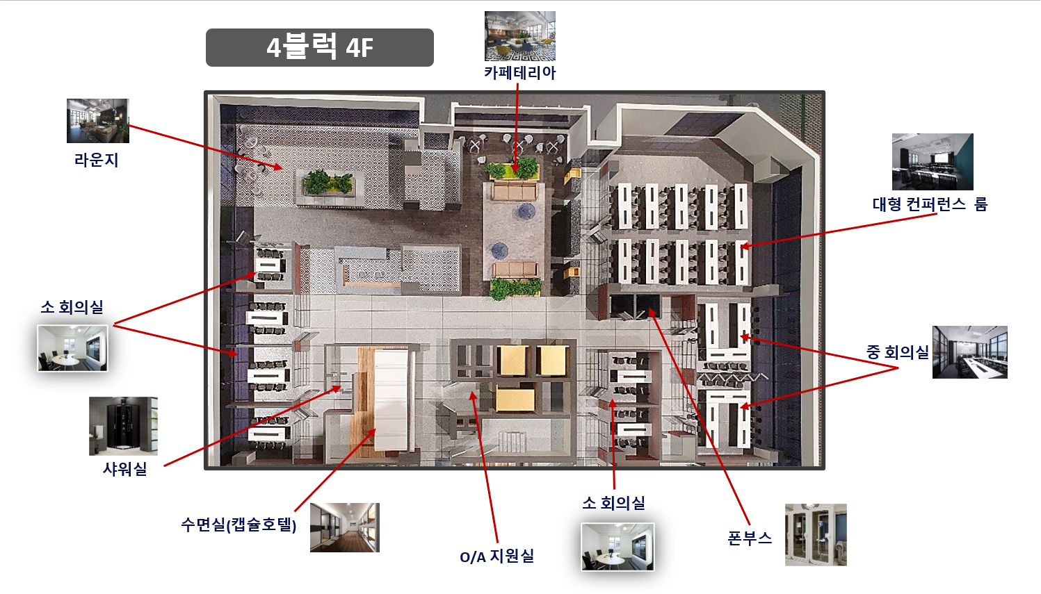 - 회의실,카페테리아,캡슐호텔,옥상정원 등 내부 편의시설