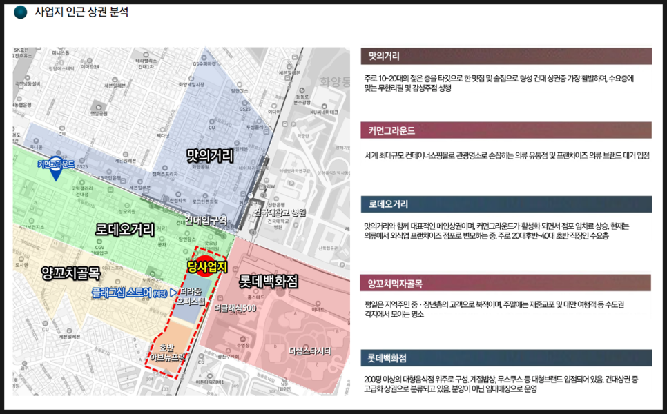 - 전국 3대상권인 건대입구역 롯데 백화점 맞은편 먹자 및 검증된 로데오 상권 초입