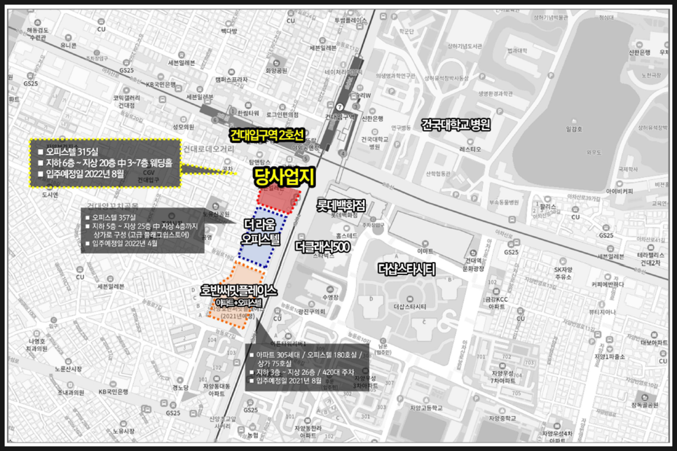 - 지하철 2/7호선 더불역세권 건대입구역 5번 출구앞. 서울 주요 도심 20분내 생활권