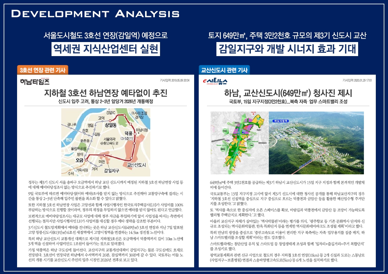 감일지구 다소 생소 하신분들도 많으시죠? 이 지구는 송파와 경계를 하고 있습니다. 동남권 비지니스의 메카로 검증된 문정법조타운이 인접 (거리상 약 5km, 차량이동 약 5분)해 있며, 행적구역상으론 경기도 하남시에 속하지만 생활권은 강동과 송파인 지역으로 아파트시세도 높게 형성이 되어 있습니다. 서울외곽순환도로 서하남IC를 끼고 위례신도시와 송파구와 맞닿아 있으면서 제3기 신도시로 지정된 교산지구와도 인접해 있습니다.