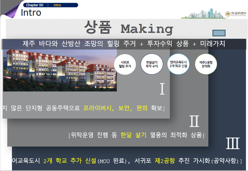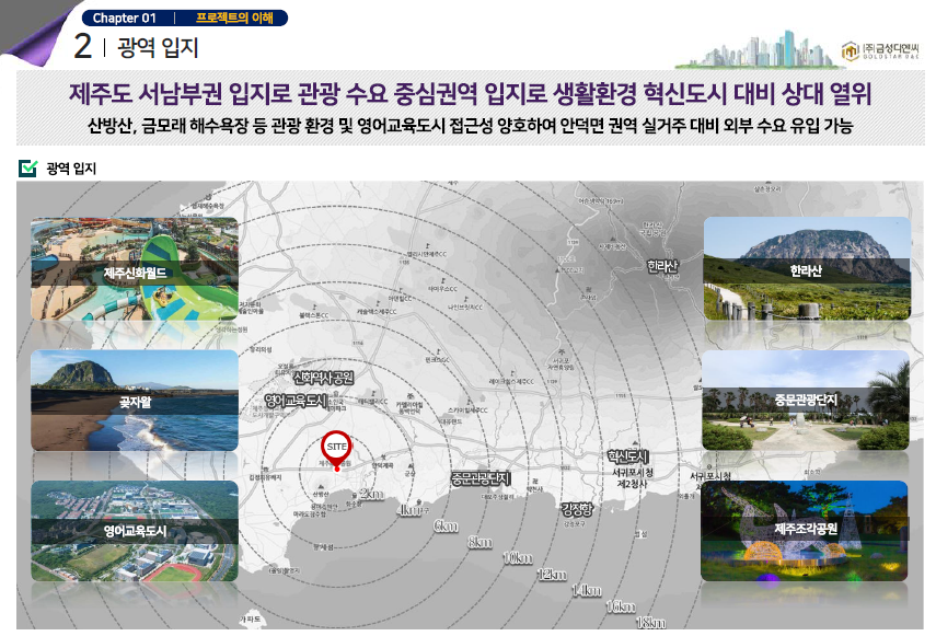 특히 제주 영어교육 생활권으로 차량 5~6분이면 영어 국제학교에 통학이 가능해 접근성이 우수하다고 봅니다. 자동차로 3분거리인 서귀포의 서쪽 관광지를 대표하는 산방산을 중심으로 차량이동 5분이면 신화월드(약 2조원투입) 녹차 밭으로 유명한 오설록 티뮤지엄, 모슬포, 송악산, 금모레해수욕장 등 관광자원 접근성이 우수한 지역입니다.