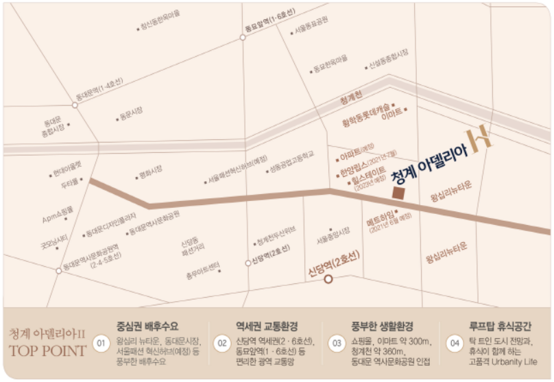 ● 청계천, 동대문 역사 문화공원, 동대문종합시장, 쇼핑몰, 이마트, 광희 초교 등 풍부한 생활 인프라