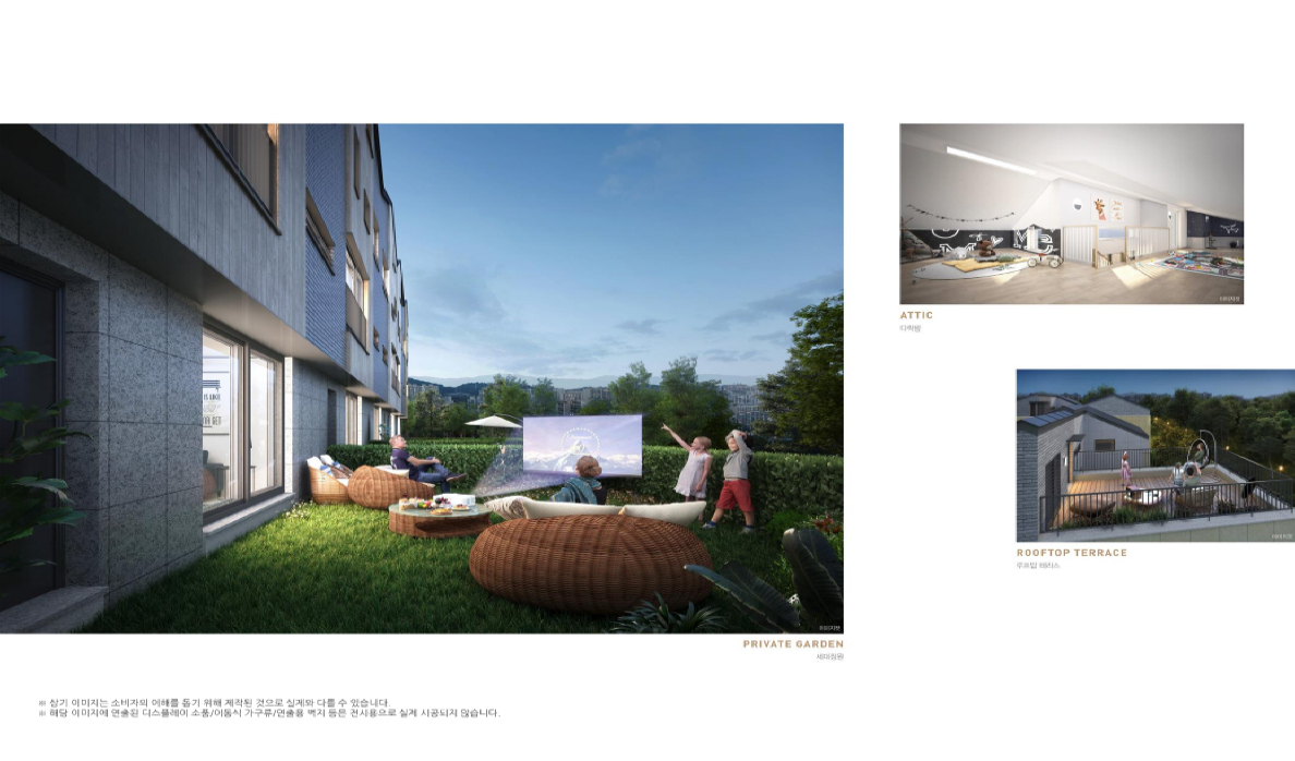1층 개별 정원, 2층 중정, 4층 다락 및 루프 테라스