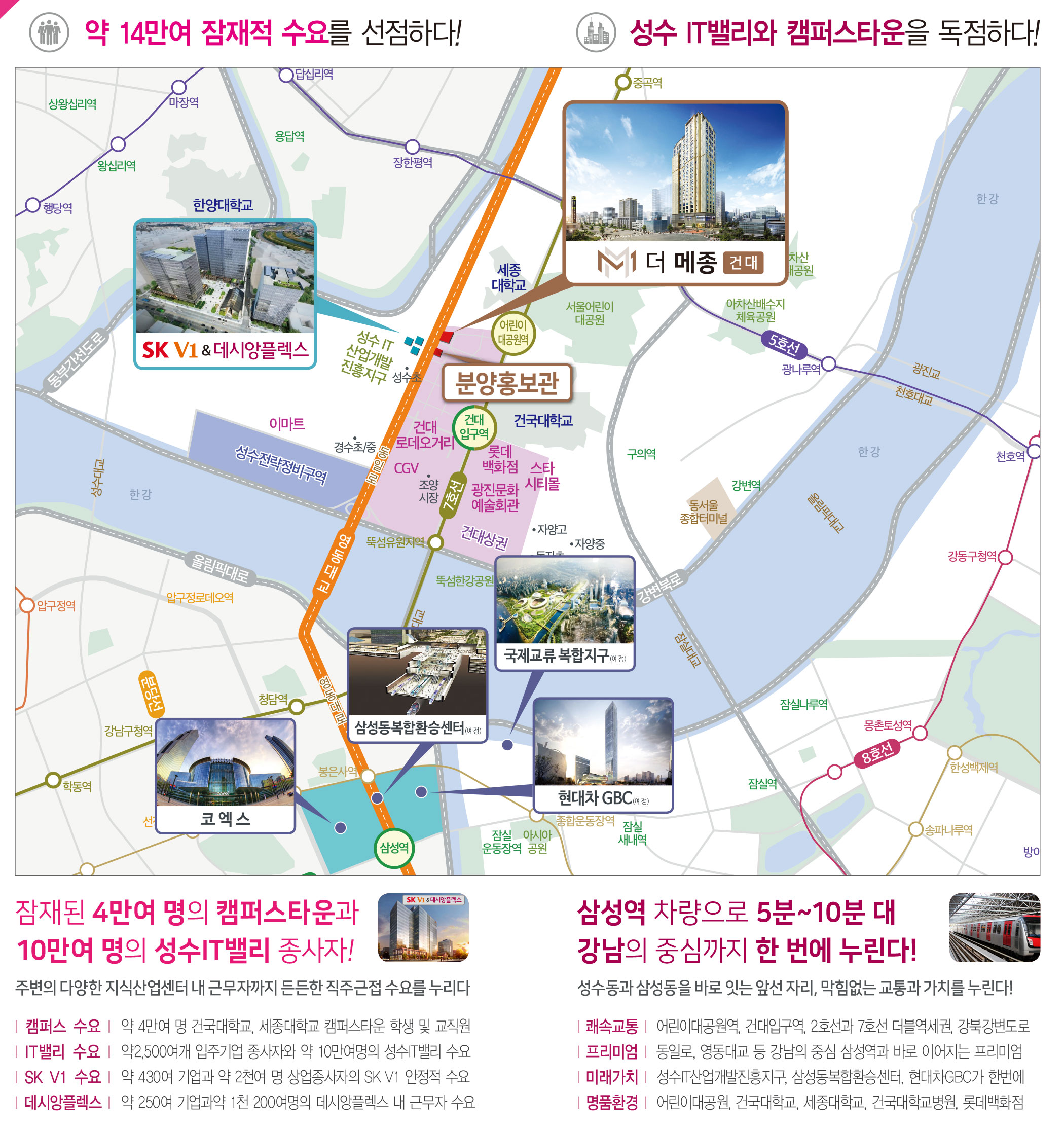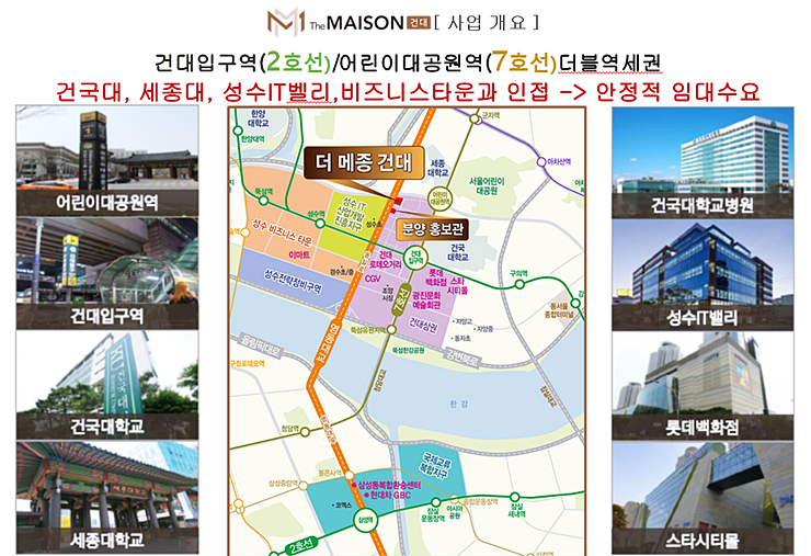 ‘더메종건대’는 유동인구가 풍부한 건대 상권과 롯데백화점, 이마트, CGV 등 다양한 편의시설을 충분히 이용할 수 있는 반면에 복잡한 상가단지와 일정 거리를 유지하고 있어 쾌적한 주거환경을 기대해볼 수 있다.