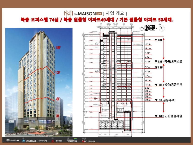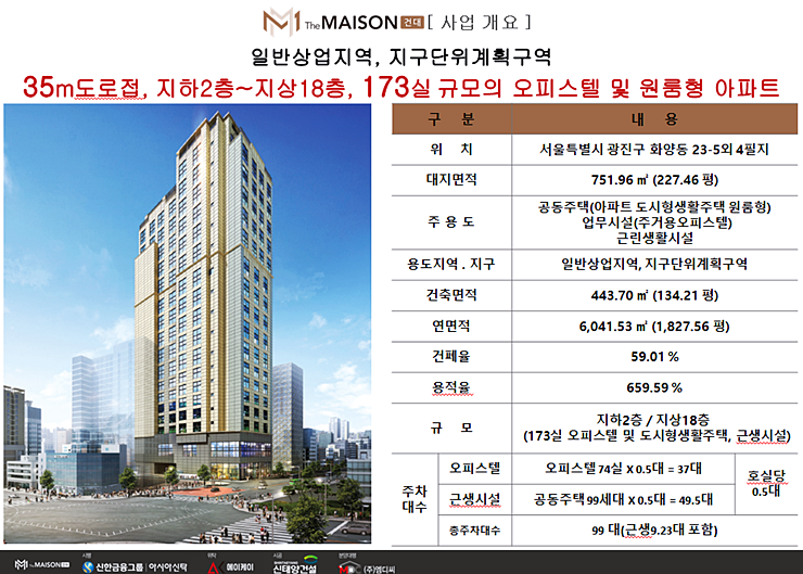‘더메종건대’는 화양사거리 인근 대지 약 230평에 지하2층, 지상 18층 규모로 들어서는 단지로, 단층형 50세대, 복층형 49세대의 도시형 생활주택과 복층형 오피스텔 74세대 등 총 173세대와 근린생활시설로 구성된다.