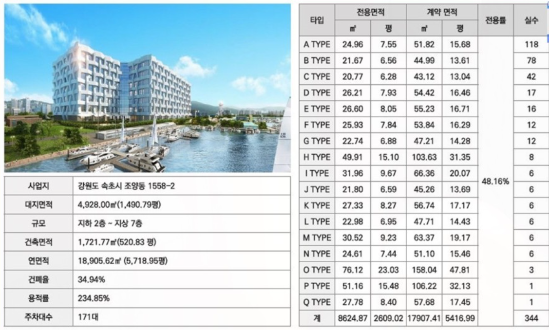이번에 분양하는 속초 마리나베이는 지하 2층~지상 7층 규모에 총 344실로 조성된다.